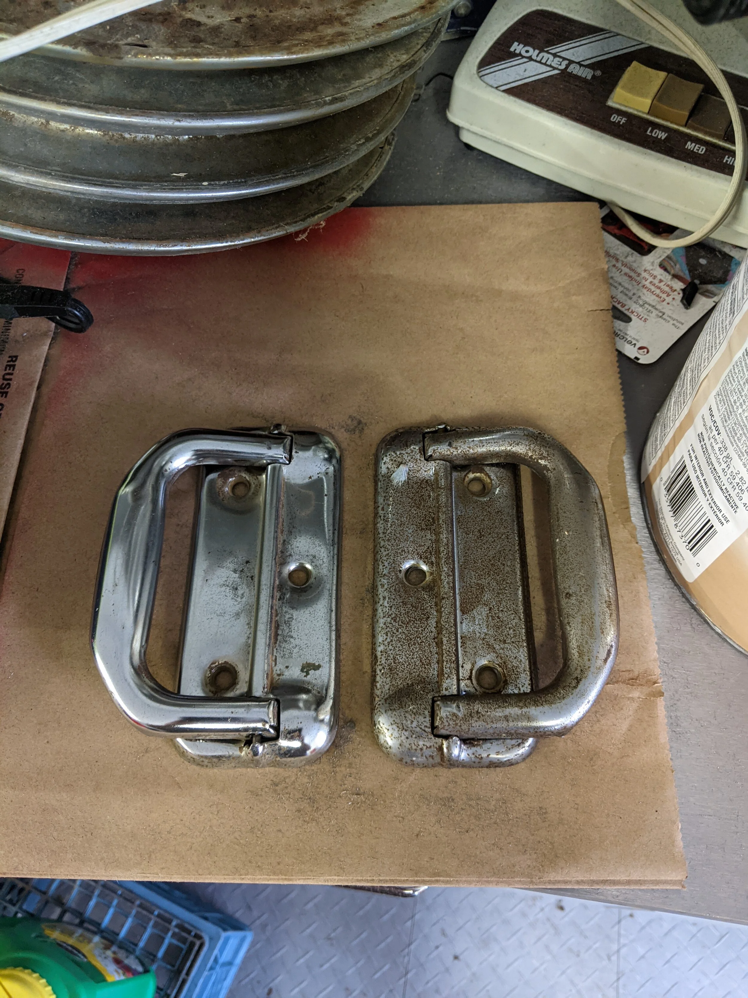 I started by disassembling the entire toolbox. All the drawers came out, the handles and locks were removed, and everything was sanded very thoroughly. I wanted a Craftsman toolbox, so I decided to paint it with the same color that Craftsman uses on their toolboxes. I picked up a few cans of Rustoleum Sunrise Red paint and repainted the entire toolbox. It was a slightly different color than the Huot Red the toolbox was previously painted, but it would now match my existing Craftsman toolboxes. I steel wool sanded the chrome handles and scraped the cork out of the drawers. Here you can see the difference in the large outside handles with only one steel wool session. I did several!