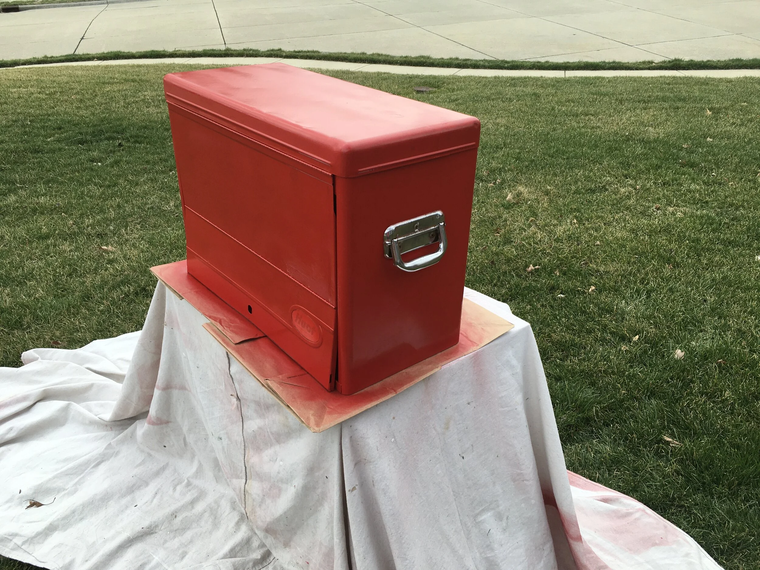 After the cleanup was complete the entire toolbox received the Rustoleum Sunrise Red paint. It made a mess. The sanding and the spray painting gave a pink haze to everything in the garage, even my hair! Here is what the toolbox looked like after one coat of paint.