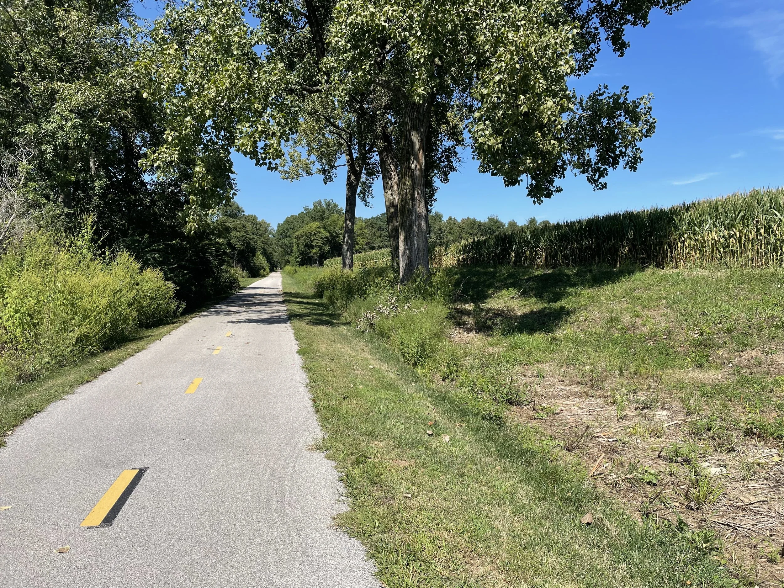 After the Bethel Road bridge the trail becomes very straight and continues through farmland and thick forest all the way to Edwardsville where the trail intersects with numerous other trails. The trail has intersections with the Schoolhouse Trail about 8 miles away in Maryville. The Schoolhouse Trail will take you west to Granite City near the Mississippi. About 10 miles away, just south of Edwardsville the Goshen Trail intersects with the Heritage Trail, which will take you east to Marine. And, once you get to Edwardsville the Goshen Trail links you up with numerous other trails that can take you either east or west for quite a ways. It is an easy trail system to explore.